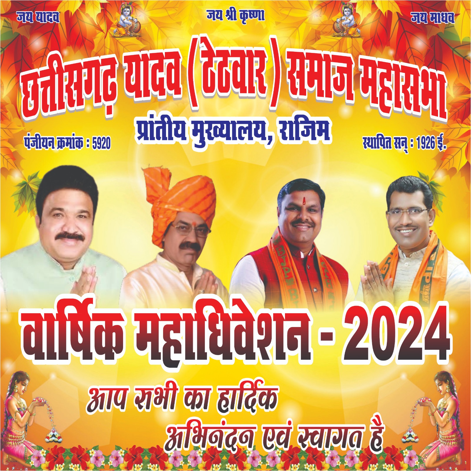 यादव ठेठवार समाज महासभा छत्तीसगढ़ का वार्षिक अधिवेशन 9 जून को राजिम में आयोजित होने जा रहा है। कार्यक्रम के मुख्यातिथि माननीय श्री द्वारिकाधीश यादव पूर्व संसदीय सचिव विधायक खल्लारी विधानसभा, अध्यक्षता श्री गुलेन्द्र यादव प्रदेश अध्यक्ष महासभा,अतिविशिष्ट अतिथि माननीय श्री गजेन्द्र यादव जी विधायक दुर्ग शहर, माननीय श्रीरोहित साहू जी विधायक राजीम विधानसभा होंगें। ज्ञात हो