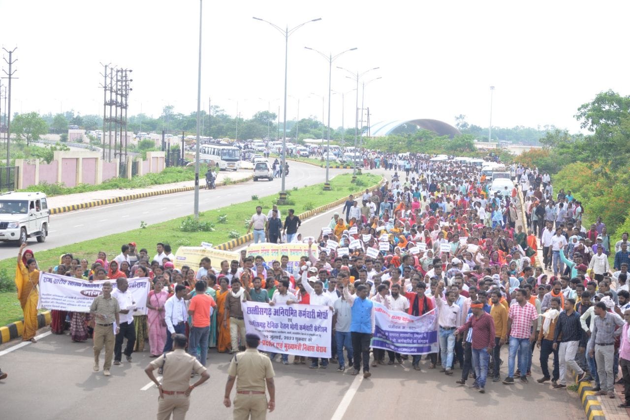 छत्तीसगढ़ प्रगतिशील अनियमित कर्मचारी फेडरेशन छत्तीसगढ़ प्रदेश के शासकीय कार्यालयों में कार्यरत अनियमित कर्मचारियों के नियमितीकरण/स्थायीकरण, निकाले गए कर्मचारियों की बहाली, न्यून मानदेय कर्मचारियों को न्यूनतम वेतन दिए जाने, अंशकालीन कर्मचारियों को पूर्णकालीन करने, आउट सोर्सिंग/ठेका/सेवा प्रदाता/समूह-समिति के माध्यम से नियोजन सिस्टम बंद करने सहित 10 सूत्रीय मांग को लेकर 20 जुलाई 2024 को तुता, नवा रायपुर में ध्यानकर्षण रैली कर रहा है।