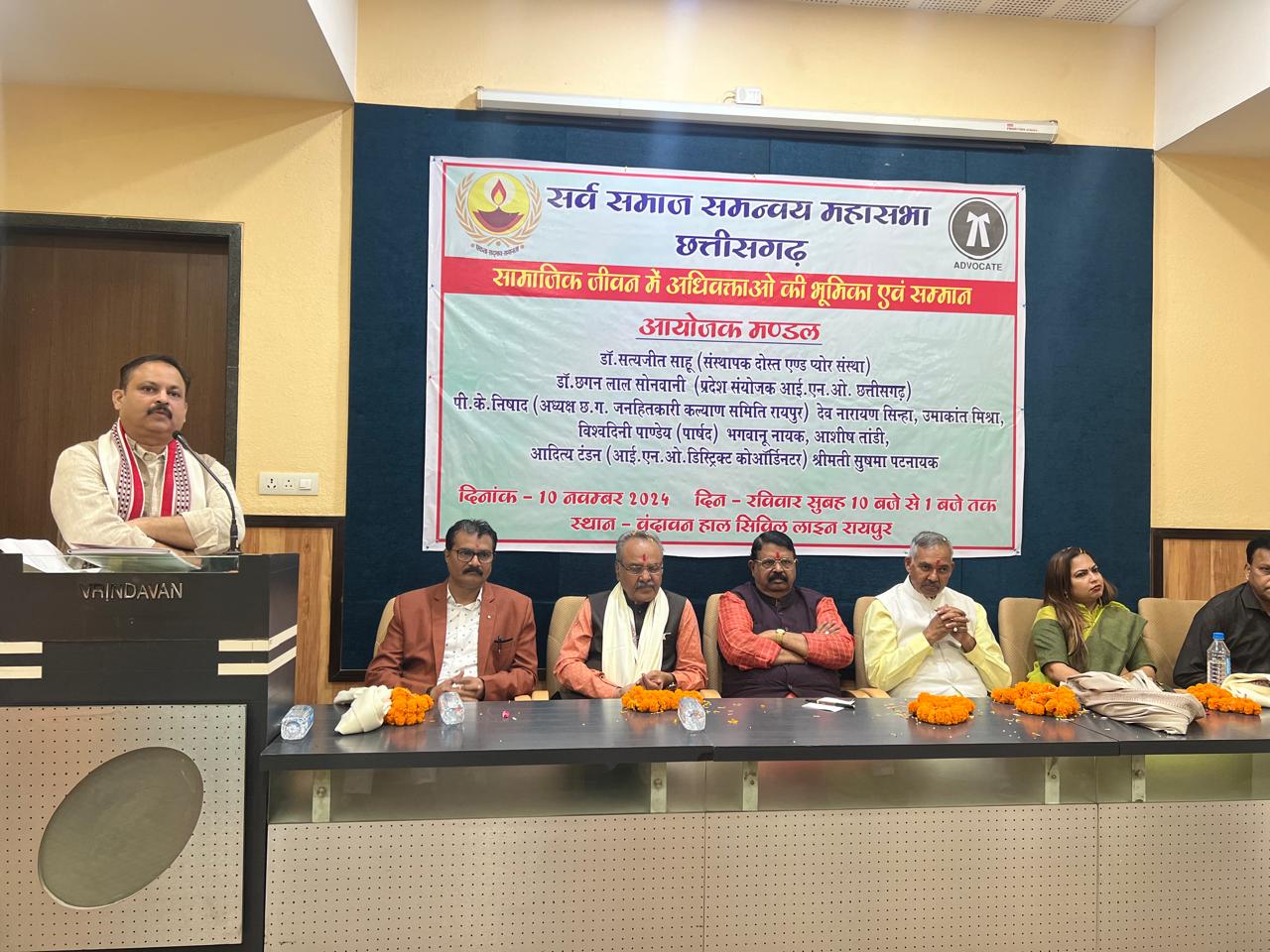 रायपुर, छत्तीसगढ़, दिनांक 10.11.2024। सामाजिक संस्था सर्व समाज समन्वय महासभा छत्तीसगढ़ के द्वारा आज राजधानी रायपुर के सिविल लाइन में स्थित वृंदावन हॉल में *सामाजिक जीवन में अधिवक्ताओं की भूमिका* विषय पर कार्यक्रम आयोजन किया गया। जिसमें विधि के क्षेत्र में विशेष योगदान देने वाले अधिवक्ताओं का *विधि रत्न* से सम्मान भी किया गया। उक्ताशय की जानकारी देते हुए आयोजक मंडल के प्रमुख सदस्य योगाचार्य डॉ सी॰एल॰ सोनवानी ने कहा कार्यक्रम के मुख्य अतिथि श्री रूप नारायण सिन्हा (भाजपा सहयोग केंद्र प्रभारी) ने कार्यक्रम को संबोधित करते हुए कहा अधिवक्ता समाज के अभिन्न अंग है जो समाज के अंतिम व्यक्ति तक न्याय पहुँचाने का कार्य करते है, अधिवक्ताओं का सामाजिक जीवन में अत्यंत महत्वपूर्ण स्थान है अधिवक्ता के बिना न्याय व्यवस्था का सुचारु रूप से संचालन नहीं किया जा सकता। कार्यक्रम की विशिष्ट अतिथि विधि सलाहकार श्रीमती नेहा गुप्ता ने कहा हम सभी को मिलकर न्याय व्यवस्था को मजबूत करने की आवश्यकता है सबको सरल और सुलभ रूप से न्याय कैसे मिले इस पर काम करने की आवश्यकता है। स्वागत भाषण देते हुए सर्व समाज समन्वय महासभा के प्रमुख डॉ उदयभान सिंह चौहान ने कहा हमारी संस्था समाज के हर वर्ग को जोड़ने और उनके बीच समन्वय करने का काम कर रहे है । सबको न्याय दिलाने का कार्य अधिवक्ता करते है उनका स्वागत और सम्मान हमारा कर्तव्य है। कार्यक्रम के मुख्यवक्ता श्री सच्चिदानंद उपासने(राष्ट्रीय लोकतंत्र सेनानी संघ उपाध्यक्ष)अपने उद्बोधन में कहा अधिवक्ताओं के सामाजिक और पारिवारिक जीवन बहुत ही कठिनाइयों भरा होता है पीड़ितों को न्याय दिलाना, लोगों की समस्याओं को दूर करना और लोगों मुसीबत से बचाने का काम अधिवक्तागण करते है। ज़िला अधिवक्ता संघ रायपुर के अध्यक्ष श्री हितेंद्र तिवारी ने कहा अधिवक्ता अपने पक्षकार के लिए मेहनत करता है और माननीय न्यायालय न्याय करता है, अधिवक्ता सम्मान के लिए काम नहीं करता लोगों को न्याय कैसे मिले उसके लिए काम करता है ,आपकी संस्था का धन्यवाद आपने अधिवक्ता परिवार का सम्मान का सोचा और अधिवक्ताओं का सम्मान किया। कार्यक्रम में आयोजक मंडल सदस्य के रुप में डॉ सत्यजीत साहू संचालक (संस्थापक दोस्त और प्योर संस्था) डॉ. सी.एल.सोनवानी ,(आई. एन. ओ.संयोजक)के पी निषाद अध्यक्ष (छत्तीसगढ़ लोक हीतकारी संध )आदित्य टंडन, (छत्तीसगढ़ स्वाभिमान संस्था) देव देवनारायण सिन्हा, उमाकांत मिश्रा ,अधिवक्ता विश्व वंदनी पांडे , अधिवक्ता भगवानू नायक ,आशीष तांड़ी ,सुषमा पटनायक, और बड़ी संख्या में प्रदेश भर से अधिवक्ता गण उपस्थित रहे। कार्यक्रम के अंत में लगभग 60 अधिवक्ताओं को मेडल, प्रमाण पत्र और वस्त्रसम्मान से सम्मानित किय