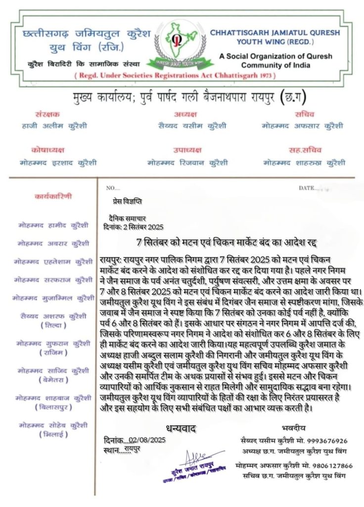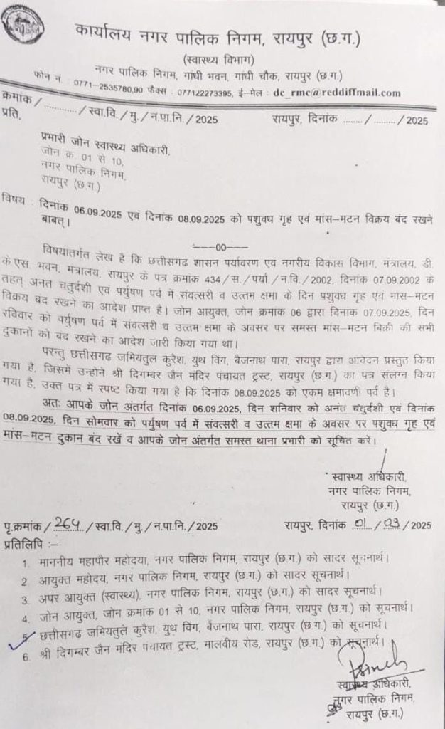 रायपुर: रायपुर नगर पालिक निगम द्वारा 7 सितंबर 2025 को मटन एवं चिकन मार्केट बंद करने के आदेश को संशोधित कर रद्द कर दिया गया है। पहले नगर निगम ने जैन समाज के पर्व अनंत चतुर्दशी, पर्युषण संवत्सरी, और उत्तम क्षमा के अवसर पर 7 और 8 सितंबर 2025 को मटन एवं चिकन मार्केट बंद करने का आदेश जारी किया था।