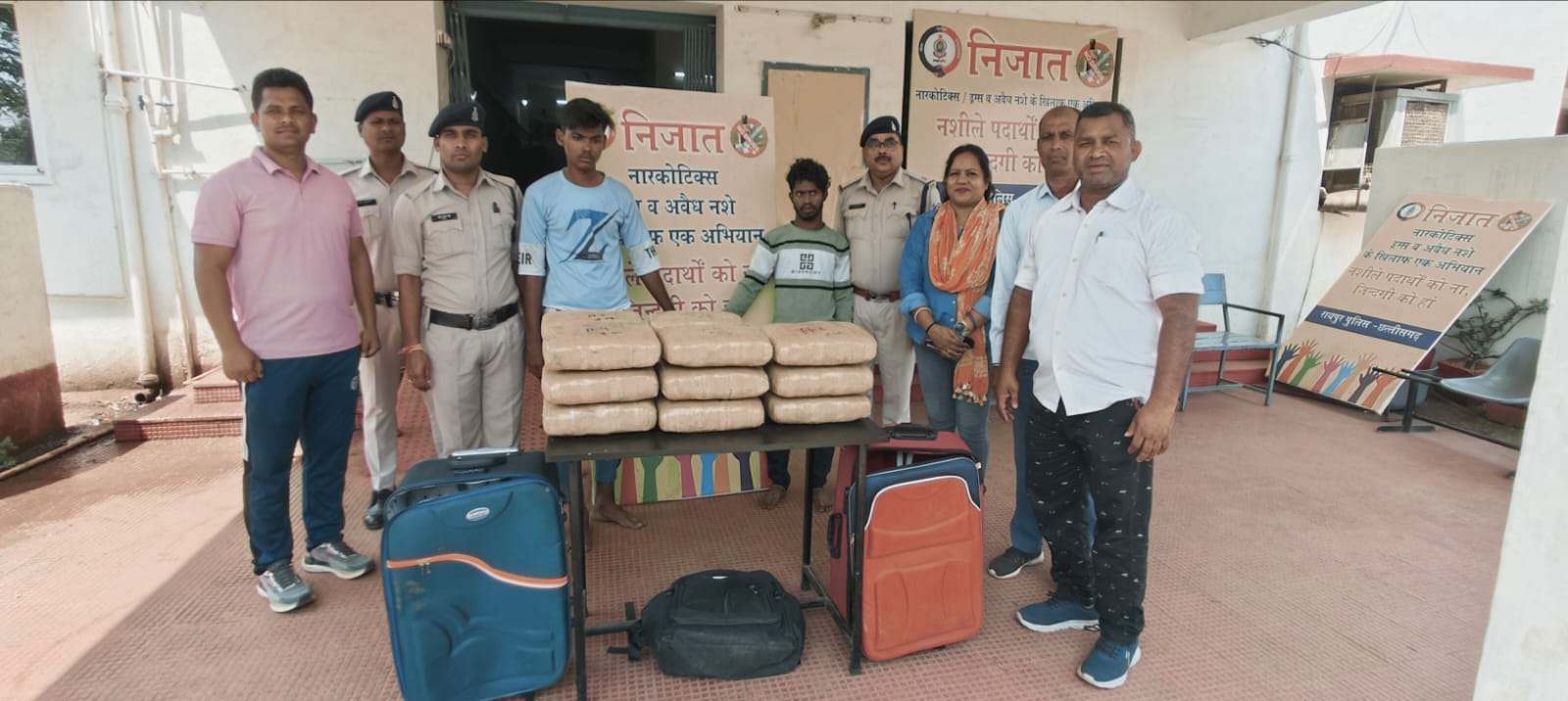 इसी तारतम्य में दिनांक 16.04.2024 को थाना मंदिर हसौद पुलिस को सूचना प्राप्त हुई कि कुछ व्यक्ति उडीसा से रायपुर की ओर आने वाली ट्रेन के माध्यम से गांजा परिवहन करते हुए मंदिर हसौद रेलवे स्टेशन में उतरकर अपने साथ गांजा लेकर बस स्टैण्ड की ओर जा रहे है। जिस पर अतिरिक्त पुलिस अधीक्षक ग्रामीण श्री कीर्तन राठौर एवं नगर पुलिस अधीक्षक माना श्री लम्बोदर पटेल द्वारा थाना प्रभारी मंदिर हसौद निरीक्षक सचिन सिंह को आरोपियों को गांजा के साथ रंगे हाथ पकड़ने निर्देशित किया गया। जिस पर वरिष्ठ अधिकारियों के निर्देशन व थाना प्रभारी मंदिर हसौद के नेतृत्व में थाना मंदिर हसौद पुलिस तथा मंदिर हसौद आर.पी.एफ. चौकी पुलिस की संयुक्त टीम द्वारा मुखबीर द्वारा बताये हुलिये के व्यक्तियों की पतासाजी करते हुए व्यक्तियों को मंदिर हसौद के बस स्टैण्ड पास चिन्हांकित कर पकड़ा गया। पूछताछ में व्यक्तियों ने अपना नाम संतोष बेहरा एवं सागर जेना निवासी उड़ीसा का होना बताया। टीम के सदस्यों द्वारा उनके पास रखे ट्रॉली बैग को चेक करने पर बैग में गांजा रखा होना पाया गया। दोनों से गांजा के संबंध में कड़ाई से पूछताछ करने पर उनके द्वारा गांजा को उड़ीसा से लाकर सूरत गुजरात तस्करी करना बताया गया। जिस पर टीम के सदस्यों द्वारा दोनों आरोपियों को गिरफ्तार कर उनके कब्जे से 30 किलो 909 ग्राम गांजा एवं 02 नग मोबाईल फोन जुमला कीमती लगभग 4,83,635/- रूपये जप्त कर आरोपियों के विरूद्ध थाना मंदिर हसौद में अपराध क्रमांक 339/2024 धारा 20बी नारकोटिक एक्ट का अपराध पंजीबद्ध कर कार्यवाही की गई।